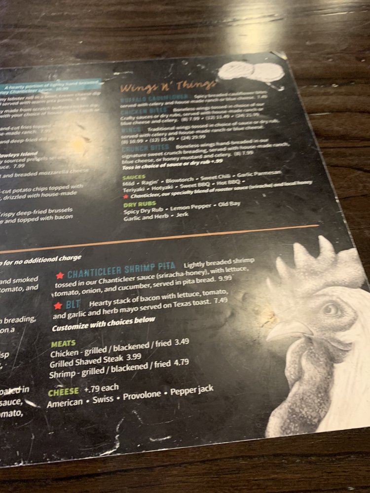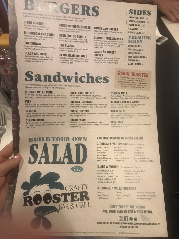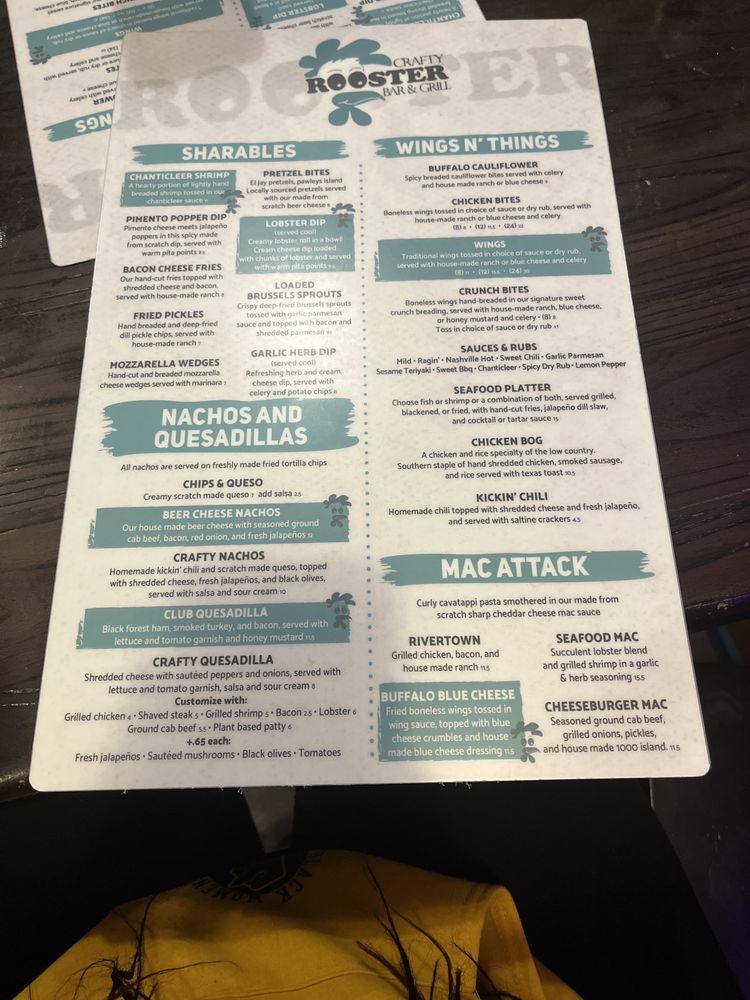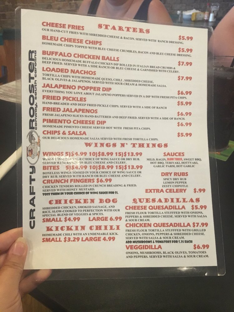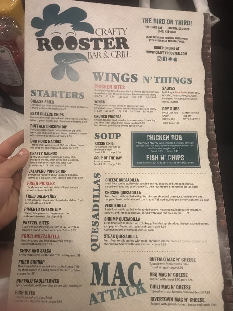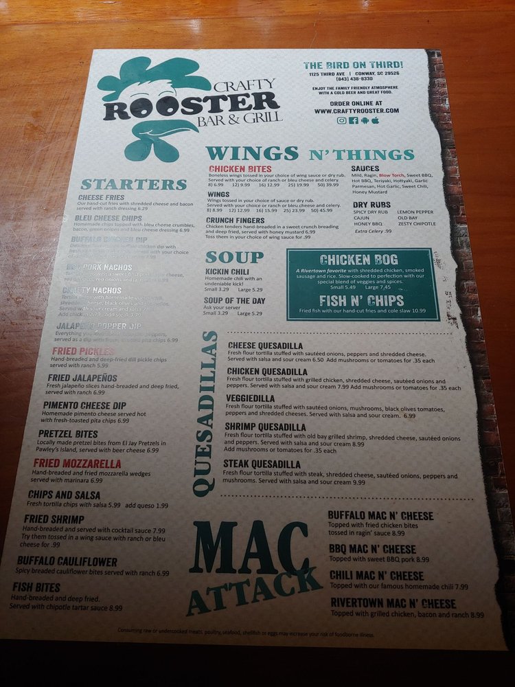 Crafty Rooster, located in Conway, SC, offers a variety of appetizers ranging from loaded nachos to fried pickles and buffalo cauliflower bites. Their menu features delicious burgers like the Mushroom & Swiss and the Black & Blue, as well as mouth-watering quesadillas such as the Chicken Quesadilla and the Shrimp Quesadilla. The bar also has a strong beer list and hosts Trivia nights on Tuesdays. Customers rave about the generous food portions, especially the wings and burgers, and praise the attentive service. Crafty Rooster is described as a cool dive bar with a great atmosphere, making it a go-to spot for breakfast or lunch. Overall, Crafty Rooster is a must-visit establishment for those seeking flavorful American cuisine and a laid-back dining experience.